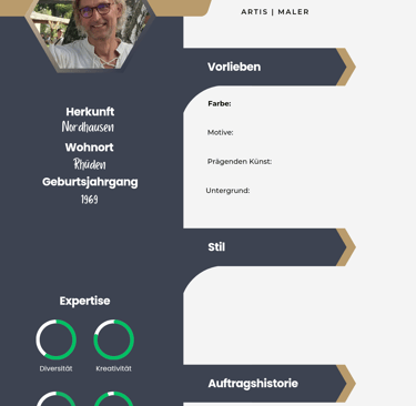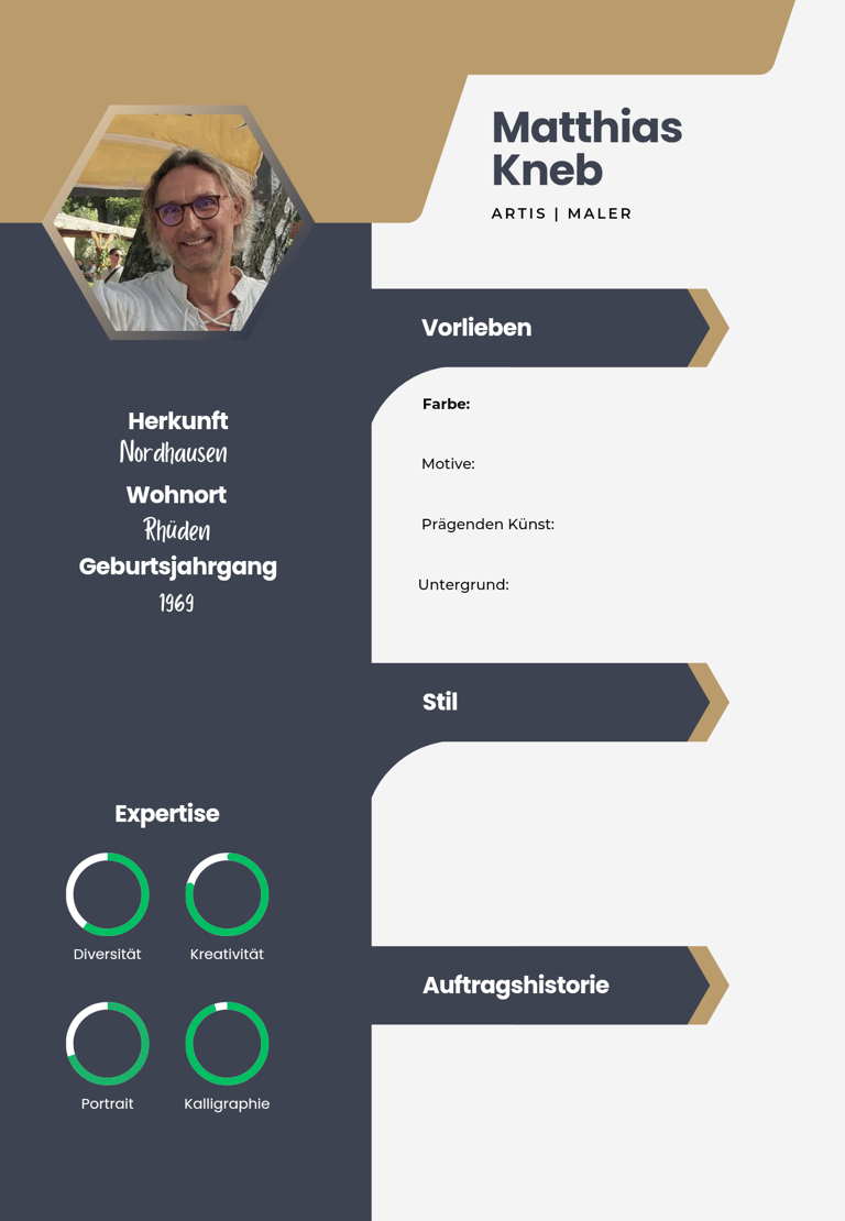 Matthias Kneb, ein engagierter Familienvater aus Nordhausen, hat sich über die Jahre in das charmante Rhüden in Niedersachsen verliebt. Seine Leidenschaft für die Malerei begleitet ihn seit über 15 Jahren und spiegelt sich in seinen zahlreichen Werken wider. Während seiner künstlerischen Reise hat er nicht nur selbst gemalt, sondern auch sein Wissen innerhalb der kreativen Gemeinschaft der "Mittwochsmaler" geteilt, wo er zeitweise als Gruppenleiter tätig war. Matthias' künstlerische Philosophie basiert auf der Idee, dass es nicht immer auf Perfektion ankommt. Vielmehr schätzt er Experimentierfreude, Selbstvertrauen und den Spaß am kreativen Prozess. Durch seine offene Herangehensweise ermutigt er andere Künstler, ihre eigene Stimme zu finden und hungrig nach Selbstverwirklichung zu streben.